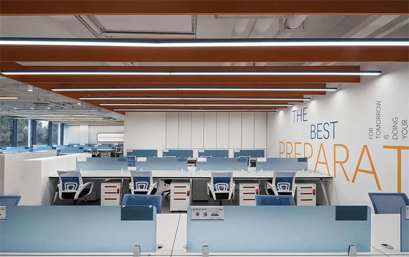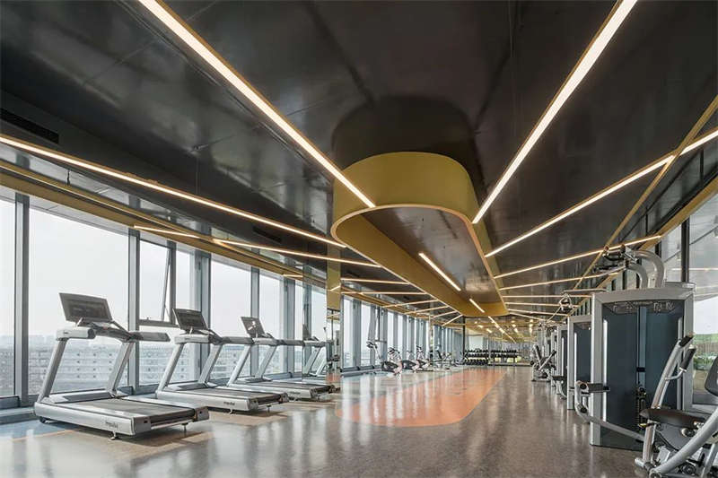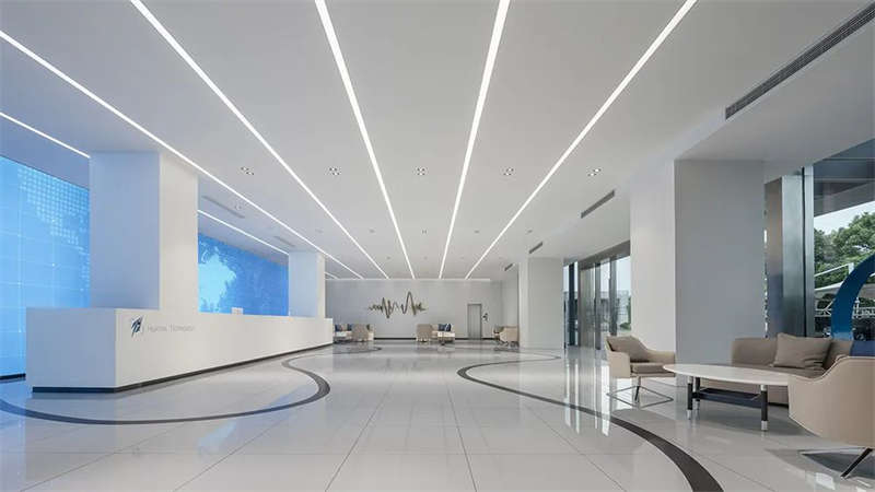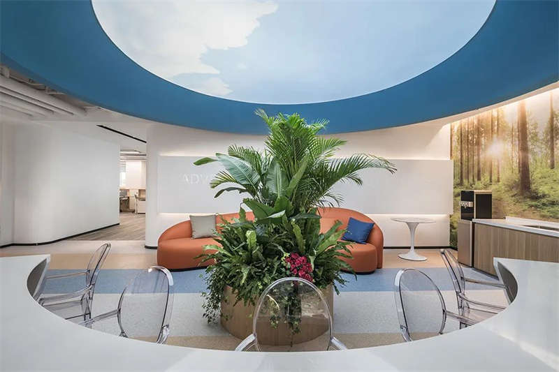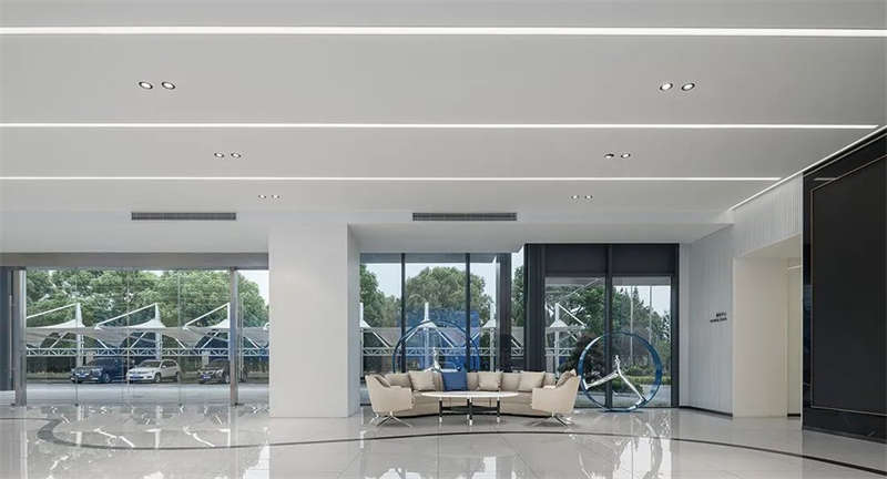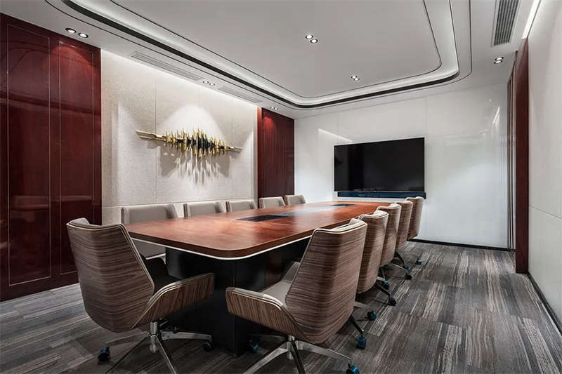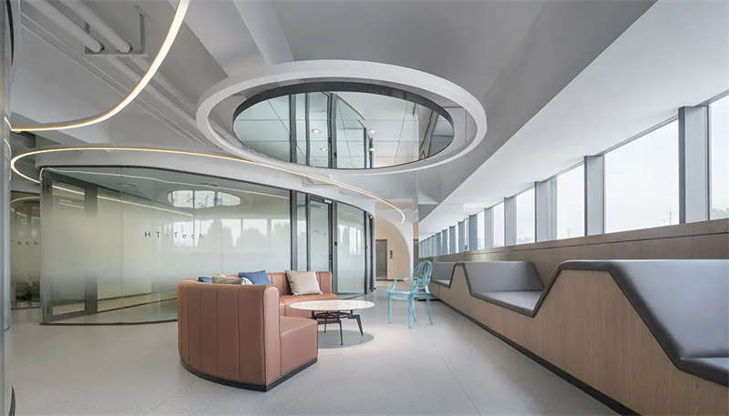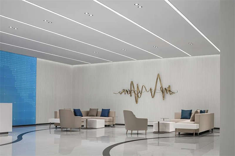 前廳頂部,鏡面質(zhì)感與光帶反射,使空間得到延伸、重疊呼應(yīng),營造出多維的視覺效果,同時(shí)打破科技辦公室設(shè)計(jì)的刻板印象,擁有寬敞開放的前臺設(shè)計(jì)、待客區(qū),層次、質(zhì)感、豐滿而厚重。
