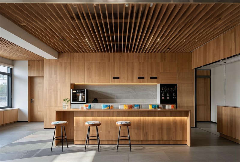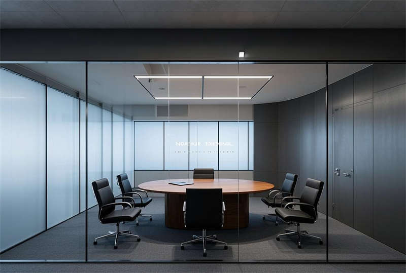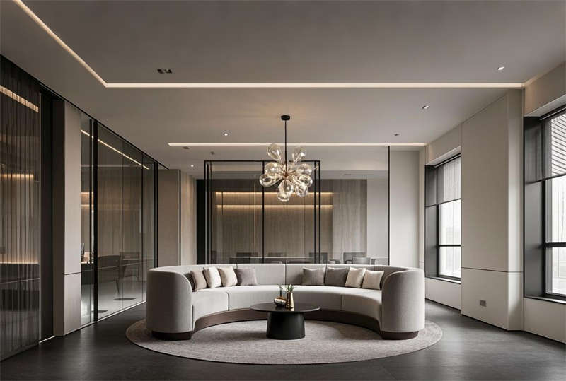 本方案采用現(xiàn)代簡約設計語言,整體空間以淺灰、白、原木三色為主基調。前臺區(qū)設置懸浮式接待臺與發(fā)光LOGO墻,搭配LED線性照明塑造企業(yè)形象。開放式辦公區(qū)采用模塊化工位布局,通過玻璃隔斷劃分功能區(qū)域,保證自然采光最大化的同時提升空間通透感。智能會議系統(tǒng)集成于各會議室,配備電動投影和書寫玻璃墻。經(jīng)理室采用深藍色烤漆木飾面提升商務質感,休息區(qū)設置咖啡吧與卡座強化員工關懷。走廊運用導視燈帶串聯(lián)各區(qū)域,茶水間六角地磚增添趣味性。培訓室階梯式布局配合吸音墻面確保聲學效果,電話間磨砂玻璃立方體兼顧隱私與采光。VIP室智能霧化玻璃實現(xiàn)空間靈活轉換,整體設計注重功能分區(qū)與人文關懷的平衡。