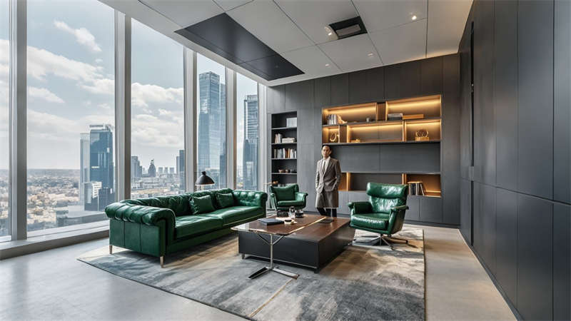 色彩體系以冷灰為主基調(diào),局部運用墨綠、深藍跳色,通過絨面、金屬、玻璃不同材質(zhì)的反射與漫射形成豐富層次。空間規(guī)劃注重功能性延展,會議室配置可移動隔斷系統(tǒng),實現(xiàn) 4 種空間組合形態(tài)。員工休憩區(qū)創(chuàng)新采用垂直綠植墻結(jié)合智能新風(fēng),PM2.5 實時監(jiān)測顯示系統(tǒng)保障健康環(huán)境。
