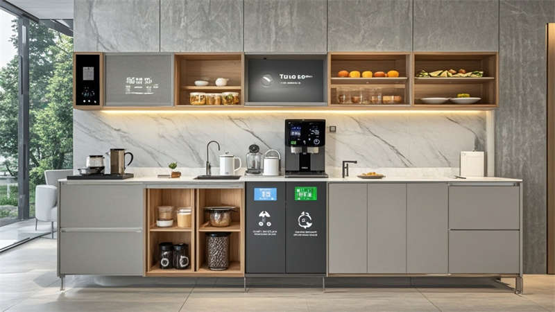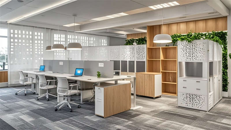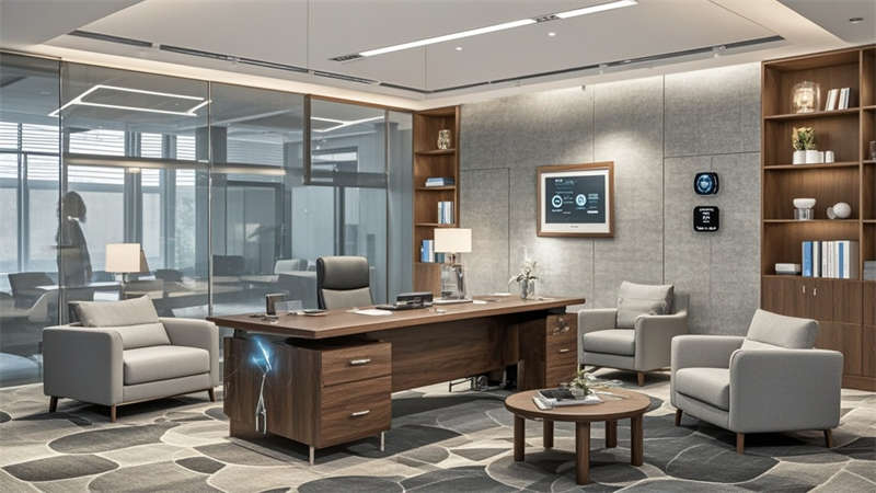 ④聲學(xué)吊頂確保35分貝以下靜音環(huán)境。色彩搭配采用70%淺灰奠定基調(diào),20%原木色增添溫暖,10%企業(yè)藍(lán)作為點(diǎn)睛色。環(huán)保方面選用LEED認(rèn)證材料,集成光伏玻璃幕墻年發(fā)電量達(dá)8萬(wàn)度。