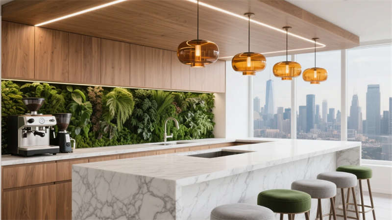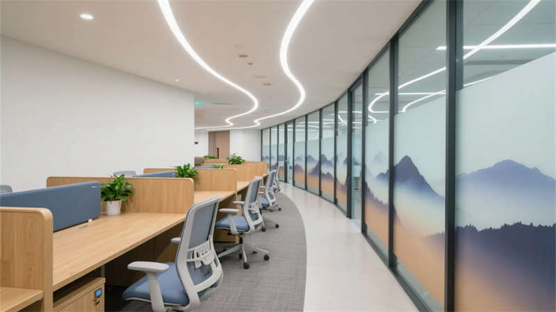 階梯式沙龍區打破傳統會議格局,弧形看臺激發平等交流,全息投影讓思維可視生長。茶水間垂直花園與咖啡香氣交織,成為非正式碰撞火花的土壤。獨立辦公區低隔斷設計延續視野通透,曲線燈帶如枝蔓延伸,提示著人與空間的有機聯結。