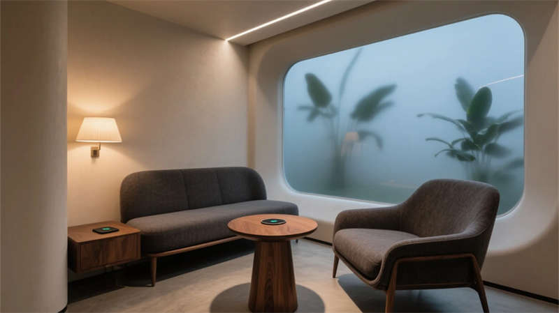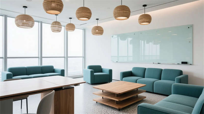 智能會議艙化身科技繭房,霧化玻璃平衡開放與隱私,觸控桌面簡化流程。貫穿始終的暖木、灰白與苔蘚綠,在全景天光下沉淀出寧靜能量。此處不僅是工作容器,更是蚌埠創新浪潮下,滋養靈感、尊重個體的未來生態聚落。