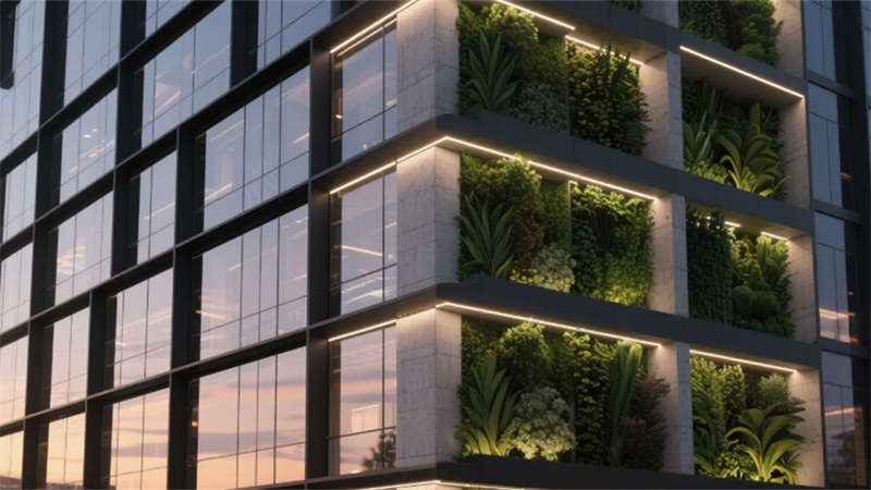 在工業(yè)肌理與自然呼吸的交織中,這座辦公樓以“輕工業(yè)生態(tài)美學(xué)”重塑城市辦公場景。外立面玻璃幕墻切割出幾何韻律,黑色金屬骨架與垂直綠植墻共舞,暮色中線性燈光如星軌流淌,將建筑化為城市中的生態(tài)燈塔。