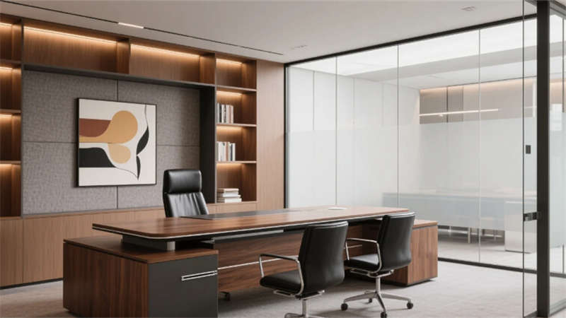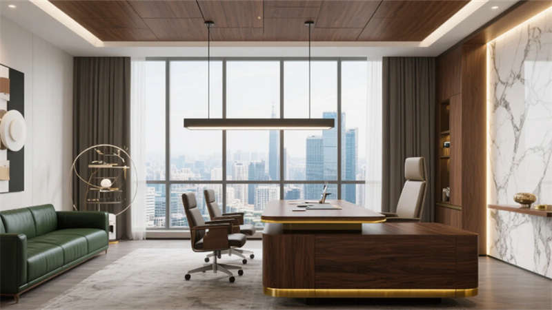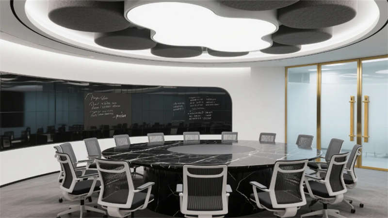 私密空間演繹克制的精致:經(jīng)理辦公室玻璃隔斷內(nèi),胡桃木書桌與毛氈吸音墻平衡理性與溫度;總裁套間則以大理石暗光墻面對話城市天際線,黃銅細(xì)節(jié)點亮低調(diào)的尊崇。會議室黑石長桌與磁吸玻璃書寫面碰撞靈感,而公共休息區(qū)陶土花盆與橄欖綠軟墊,在混凝土中島上生長出松弛的煙火氣。