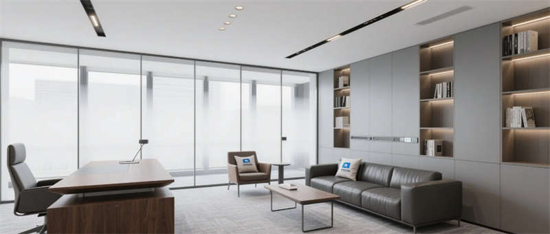 高管辦公室通過灰玻霧化膜實現私密與通透的辯證,胡桃木辦公桌與深灰沙發組演繹商務美學,隱藏式智能控制系統將科技感融于無形??萍紩h室創新采用環形桌體與360°攝像系統,陣列麥克風與補光燈帶打造沉浸式遠程協作場景。從光伏玻璃幕墻到模塊化綠植系統,從智能升降辦公桌到節能設備集群,每個細節都銘刻著可持續發展的空間基因。