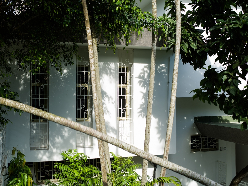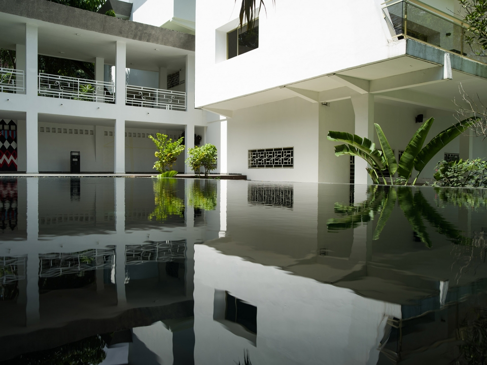酒店外觀局部,建筑在泳池中投下倒影,部分外部視圖,池反射建筑物。健身房和養生區位于原建筑的廚房處,擁有良好的自然通風以及朝向。游泳池又長又窄,客人們可以在其中進行來回往復式的游泳運動,同時還在炎炎夏日里為客人們提供了一個消暑空間,當地樹木的葉子和開花植物則為泳池空間提供了遮陰處和裝飾。