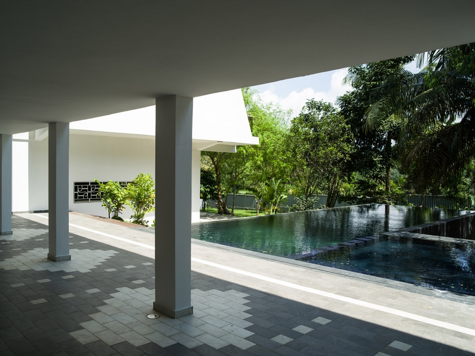 站在走廊上看泳池,室外狹長的泳池,棕櫚樹蔭提供了遮陽空間。花園也充滿了自然的意趣,給人一種放松之感,建筑師還在花園的地面上鋪設了新的灰白兩色圖案的地板,不僅在室外空間中創造了一種視覺聯系,更是將室外空間統一了起來。