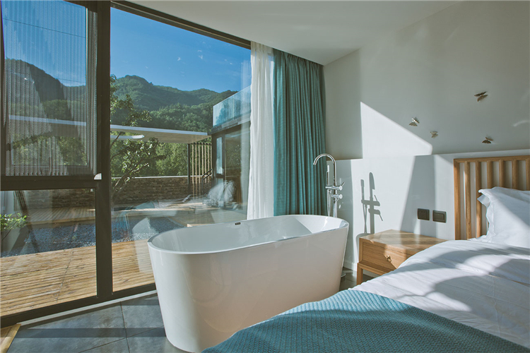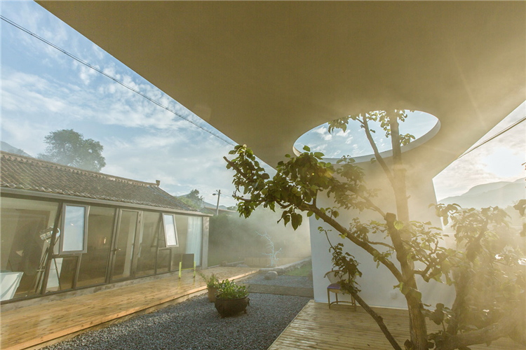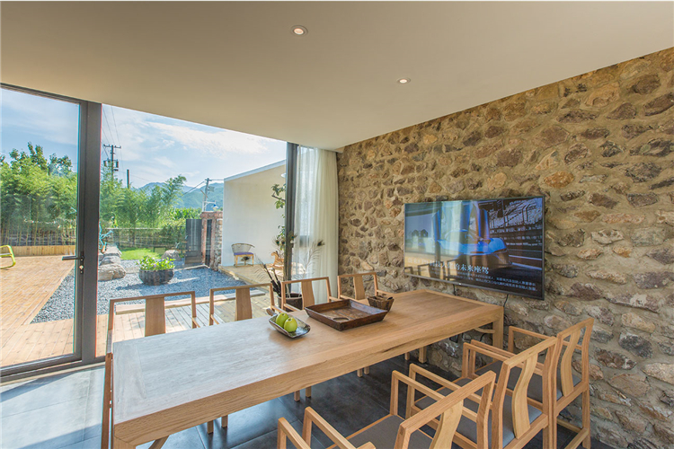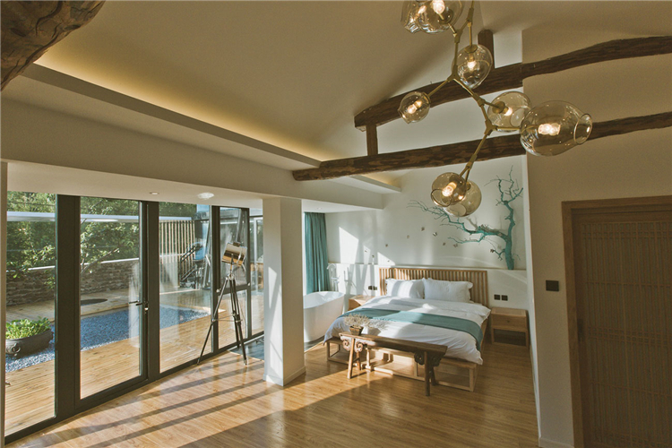 “隨著越來越快的生活節奏我們每天奔忙,每天遺忘城市越來越近,鄉村卻越來越遠”。這所名為“畫框里”的民宿位于水泉子村,而名字寓意為將百里畫廊的山水美景留在畫中院中。可看到名副其實靈動的山水畫這四季的變幻,凝集了我們對生活所有的向往。落地窗邊放置了浴缸做一個泡泡浴一眼望去是院落的美景和遠山的意境。主臥空間很寬敞,新中式的原木配灰色的簡易家具些許的現代元素金屬攝影燈使房間內多一份輕松感。