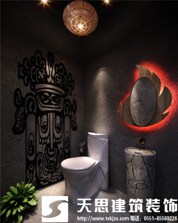吧臺處,由瑪雅建筑紋理拼接的背景墻以及傾斜的人面雕塑敲碎的太陽歷都展現著一種不可逆轉的歷史思維,形象精美的浮雕彰顯出貴族氣質和王者風范。所有素材原始自然沒有冗余的修飾,在簡約純粹的大背景下,巧妙鋪排空間,著力烘托出有內涵、高品位、精英范兒、國際化的精神理念。