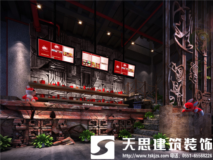 此案運用破碎的瑪雅建筑紋理作為主元素貫穿整體空間設計,將消失的瑪雅文化融入到設計風格里,用藝術化自然化的設計手法將簡陋的空間置換為國際潮流空間設計風尚。僅用一根從底層直穿二樓的人面雕塑就巧妙規避了空間的局促感,成為整體空間設計最凝練的一筆。整體空間基調沉穩,清水混凝土、石頭以及原木都為統一的暗色系,為了突出火狐的特色,將紅色引入空間,不僅活躍了空間,也讓品牌形象悄然流露。