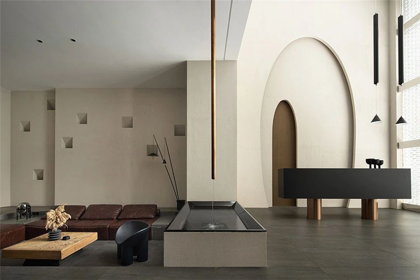 中性的色彩美學為基調,無彩色與暖調的咖色相互補充,一抹深色,使空間靜默下來,將溫柔緩緩釋放。柔涓的水流墜落在水面上,蕩起一圈小渦,我們喜歡這種流動性,有種輕盈的感覺。