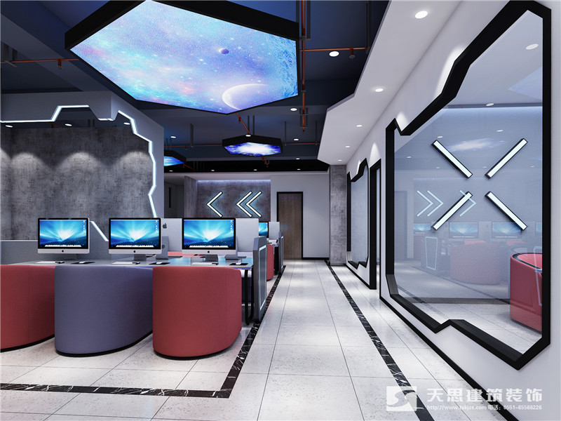 根據(jù)業(yè)主的要求,網(wǎng)咖設(shè)計的整體顏色以淺色為主,中間穿插對比強烈的撞色系來展現(xiàn)效果。