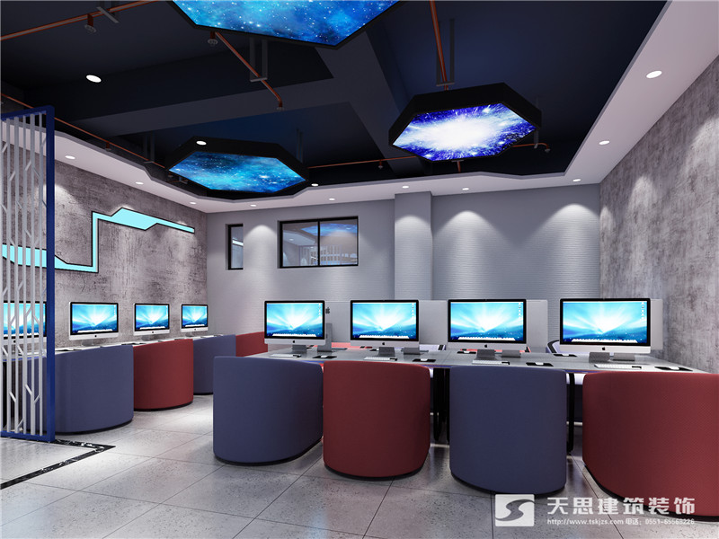 網(wǎng)咖設(shè)計的隔斷很少,只是用少量原始柱體來做裝飾,增加整個網(wǎng)咖的通透性,放大網(wǎng)咖的面積,是整體具有的大氣,恢弘的效果。