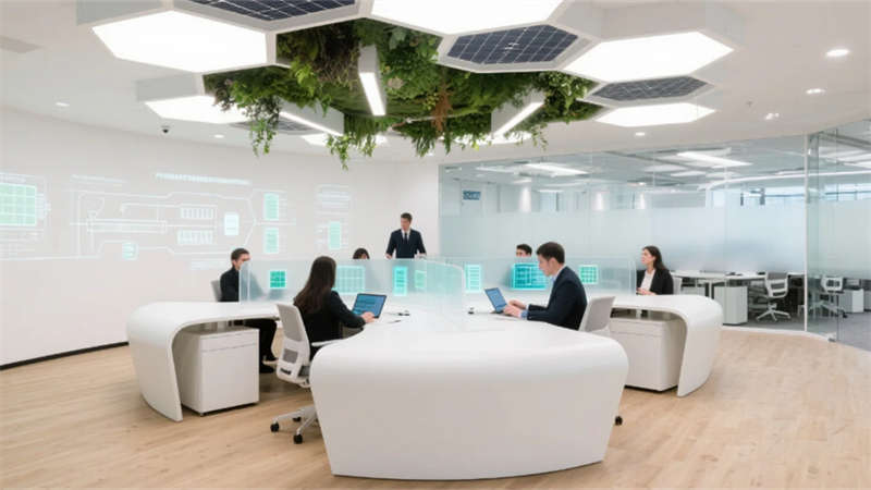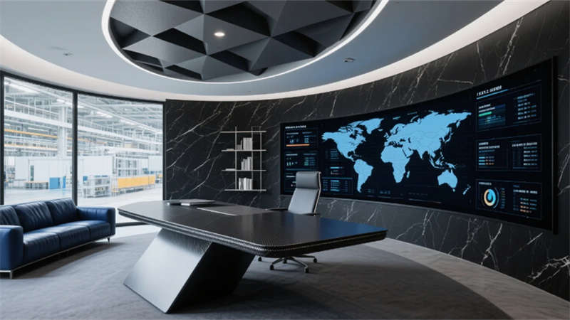 開放式辦公區打破傳統壁壘,蜂窩狀工位與懸浮綠植裝置詮釋靈動協作,透明屏幕上的數據流與玻璃隔斷投影的生產流程圖虛實相映。總裁空間則如懸浮的智慧中樞,弧形落地窗將車間全景化作動態壁畫,金屬與大理石的碰撞間,流淌著決策與創新的電流。智能倉儲區立體貨架的金屬骨骼間,無人機如蜂鳥般掠過貨品,天光與電子標簽的光斑在環氧地面上跳動著數字時代的韻律。
