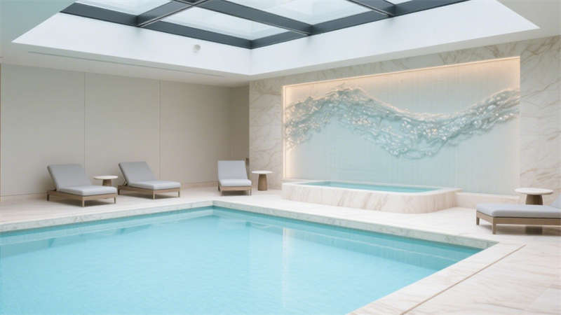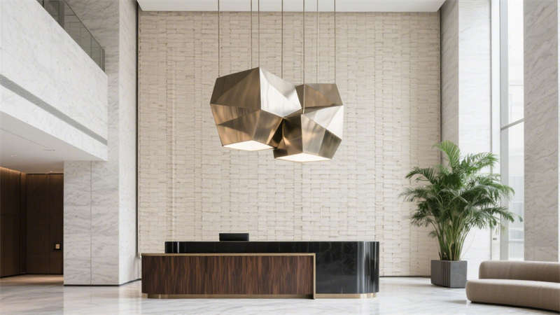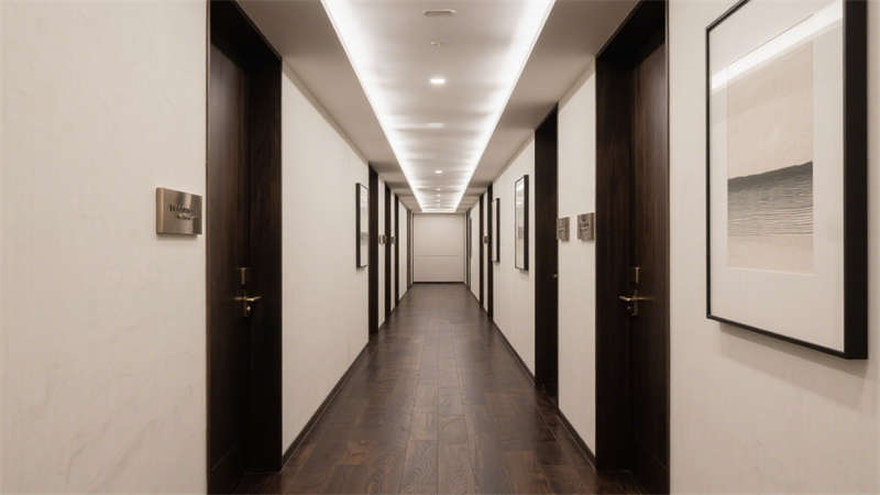 在公共區(qū)域,大堂以開闊通透的布局呈現(xiàn),大面積的落地玻璃引入充足自然光線,讓空間更顯明亮通透。接待區(qū)選用柔軟的布藝沙發(fā)與金屬質(zhì)感的裝飾擺件相搭配,既傳遞出溫馨的氛圍,又不失精致格調(diào)。走廊設(shè)計(jì)則注重引導(dǎo)性,墻面采用肌理感材質(zhì),搭配嵌入式燈光,營(yíng)造出靜謐而優(yōu)雅的行走體驗(yàn)。