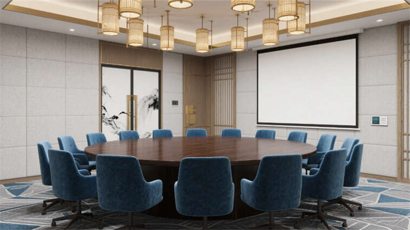 步入大堂,深胡桃木墻面與淺灰石材地面構成經典東方底色,水墨藝術玻璃屏風似山巒疊嶂,懸浮竹編吊燈以編織肌理軟化空間。靛藍色沙發與黃銅細節的點綴,既延續外立面色彩邏輯,又激活視覺層次。餐飲空間延續木格柵語言,竹編燈罩與黑陶器皿在開放式廚房的金屬框架中碰撞,演繹“新舊共生”的餐飲儀式。