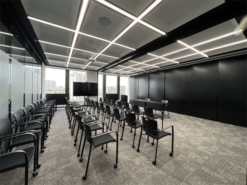 所有的會議室中,電視屏背景墻均以縱橫相交的豎條黑色U形槽做了分塊處理,在電視屏幕安裝位置上保持了統一原則,電視屏垂直居中,上下線條與背景墻上部、底部的距離相等。諸如此類的設計,使得辦公空間視覺條理性得到了加強。