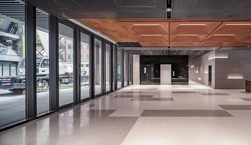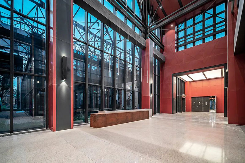 低飽和度紅色鋼板與黑色鋼板形成視覺碰撞,銹板前臺、懸浮燈飾與金屬結構架讓空間闊達簡練,通高的玻璃幕墻借景舊建筑的殘影,使之成為室內裝飾的一部分。
