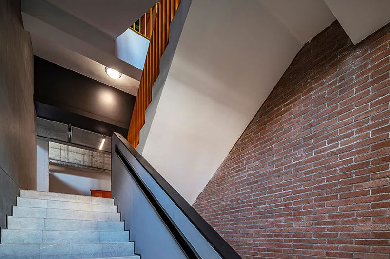 室內空間造型多以棱角分明的幾何形體為主,減少裝飾類細部,鐵銹褐、水泥灰、煙熏黑等暗冷色調元素交織在一起。局部通過紅磚作為點綴,減少淺色系材質的使用,讓自然光線將空間變得更有質感。