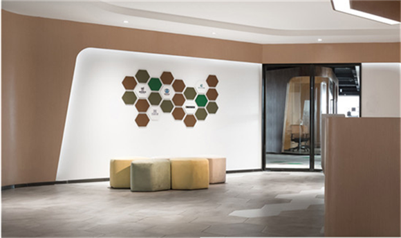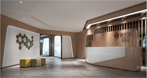 通過空間調度,模糊各個工作區域間的界限,打造既開放、又不乏私密性的辦公區。除此之外,曲線與直線在空間共存,線條的形式感使辦公室充滿現代化與創意十足,極大的在視覺上滿足了客戶的營銷訴求,構建來人第一感性認知。