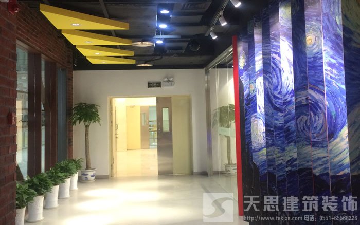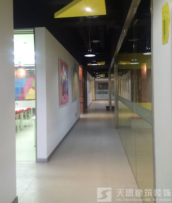 以下圖片,節(jié)選自待完工的工地現(xiàn)場,分別是入口、大廳、過道、教室、活動中心等功能區(qū)域。整體選擇LOFT混搭風格,裸露的天花板+墻面,搭配現(xiàn)代元素,既節(jié)省了裝修成本,也營造了“藝術人生”的環(huán)境。