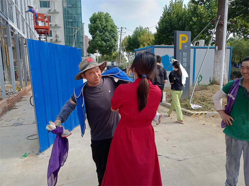 一到項目工地,就看見了一線工作者在40度酷暑的天氣下勞作,每一滴汗水都是辛苦工作的象征。胡主管將公司領(lǐng)導(dǎo)買的礦泉水,冰袋和安全作業(yè)馬甲都搬了下來,招呼一線工作者過來喝水休息一會。在慰問施工勞務(wù)作業(yè)人員時,她強調(diào),要多方舉措防暑降溫,保證高溫作業(yè)條件下員工的身體健康;要科學安排作息時間,避免疲勞施工,保證安全。