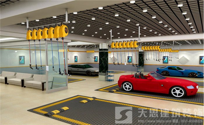 汽車美容工位是汽車美容店的客戶車輛進行施工的場所,因此在這里裝修要盡量考慮水電氣股的吊放,可以兩個車位公用一個水電氣股,節省成本。