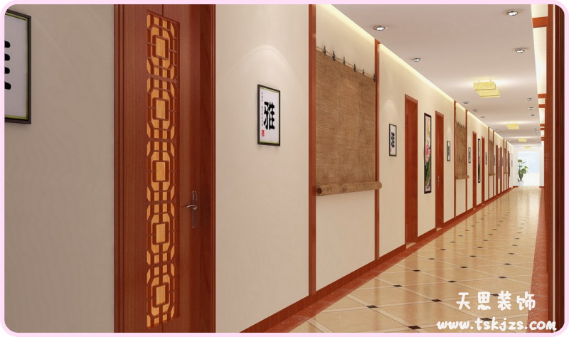 走廊是室內流通空間的主要部分,其空間特點是狹長,且缺少變化,人在這種空間中容易產生單調感。因此,在設計上應做一定的藝術處理。使其既不能過于華麗、復雜,也不宜過于簡單、呆板、應在墻壁上做一定的裝飾點綴。如做出口線、偏倚柱、外門套和墻壁裝飾線條的藝術處理,以及字畫或燈光的點綴。在特殊功能區(qū)的路段,可以做色彩變化或不同的裝飾處理,從而形成 統(tǒng)一中有變化的視覺效果。在通常情況下,走廊的設計要求是:應有充足的光照度、統(tǒng)一和諧的界面裝飾,清新淡雅的色調和明確的導向指示。