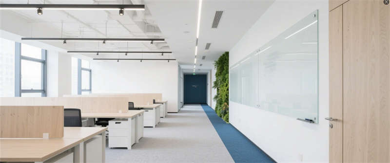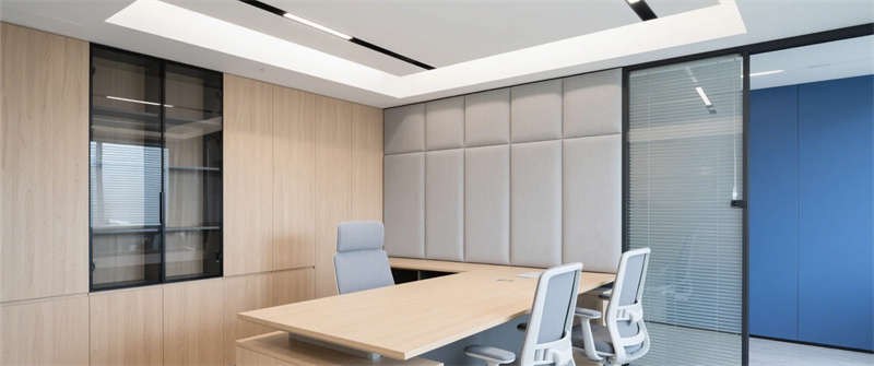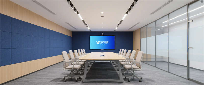 • 智能會議室:深藍色吸音墻面呼應企業VI色,智能屏幕與玻璃隔斷凸顯科技屬性;