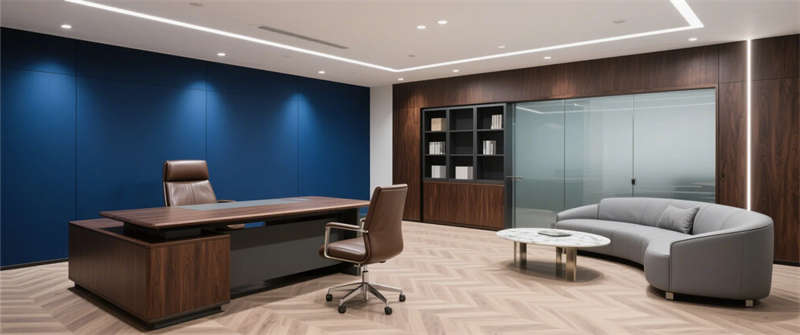 • 總裁辦公室:人字拼木地板與深胡桃木家具提升質感,深藍藝術漆背景墻強化品牌識別;