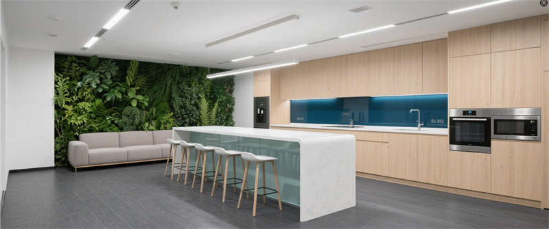 • 休閑茶水間:白色吧臺與綠植墻營造松弛氛圍,地膠材質耐磨易清潔。