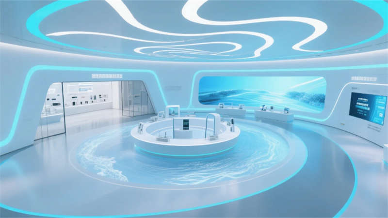 展廳以環形動線串聯六大核心模塊:入口10米寬LED水幕墻動態演繹凈水原理;中央懸浮式產品矩陣展臺,通過全息投影拆解RO膜過濾技術;實景化場景區1:1復刻家庭廚房、商務辦公樓及工業廠房,搭配交互式水質監測實驗臺;獨創的“虛擬管家”AR系統,可生成個性化凈水方案并投射至合肥典型戶型模型。空間頂部采用參數化設計的波浪形燈網,象征長江與淮河水系交匯,地面嵌入城市節水數據可視化地磚,凸顯本土環保責任感。